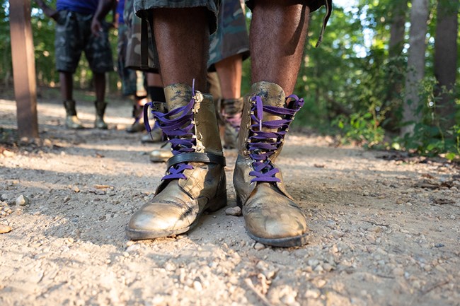 Aesthetically, this scene showcases the standard gold boots that Omegas wear. They are shown kicking up dust on the trail to align with the quote in Maya Angelou’s poem, “But still, like dust, I rise.” Historically, the gold boots symbolize the horseback ride of Colonel Charles Young, a pioneer military, diplomat, and civil rights leader, who was a member of Omega Psi Phi, Inc. As commander of a famed African American Buffalo Soldiers unit, he traveled from Wilberforce, Ohio, to Washington, DC, to prove to the US Army that he was fit for active duty. The gold boots mirror the dust on his boots from the journey. Additionally, and importantly, Colonel Young was the first African American superintendent of a national park (Sequoia & Kings Canyon National Parks) and his many accomplishments are commemorated at the Charles Young Buffalo Soldiers National Monument in Wilberforce. Omega Psi Phi Fraternity, Inc. is also a philanthropic partner of the National Park Service.