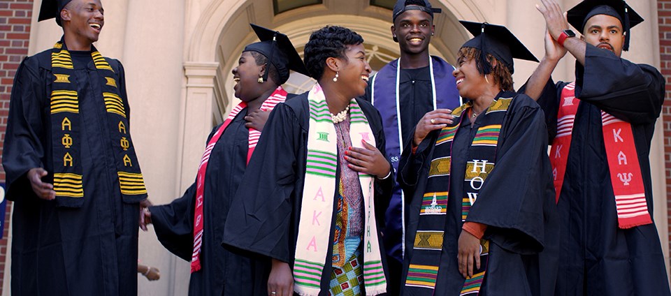 This scene was filmed at Founders Library on the campus of Howard University in Washington, DC, a Historically Black College and University (HBCU) founded in 1867 by missionaries as a training facility for black preachers. It was decided that the school would be named after Civil War hero General Oliver O. Howard, a white man who served as the Commissioner of the Freedman’s Bureau and the university’s first president. The bureau, which was founded in 1865, was a US government agency that aided freed blacks. Howard University would see to the education of 150,000 formerly enslaved people by 1872. Founders Library is the leading research library and archive on African American history and culture. Howard alumni and current students are shown standing in black caps and gowns with various types of stoles. Some of the participants are members of Greek organizations and represent their sororities and fraternities with their stoles. Other participants wore blue and white stoles, Howard’s school colors, or Kente cloth, which is significant in the African American community. Kente cloth originates with the Ashanti people in Ghana. It is common, especially among HBCU students, to wear this type of stole on the day of their graduation as a sign of the global African diaspora.