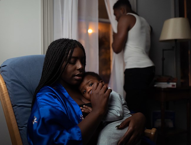 This scene is also coupled with the innocence of black youth. Though the opening lines of the poem discuss feelings of fear, pain, and loss, Maya Angelou then transitions with hope by expressing, “And yet each of us have awaken, arisen.'' These lines feature the baby in his crib looking up in awe and wonder at his mother and father. To reinforce the importance and beauty of the black father and son relationship, we included a scene where the father is bathing his baby boy in a sink. Placing the child in the sink recognizes the tradition of washing young babies in the sink when they are young. Notice that in the opening scene the father is seen with a look of distress with worry about the outside world, while in the second scene he is in the comfort of his home, full of happiness while engaging in the joyful laughter and glee of his son.