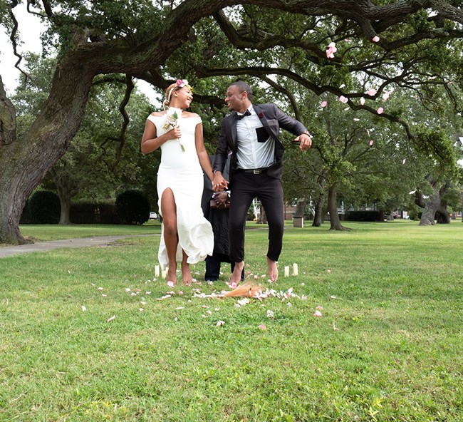 This scene depicts the ceremonial union of a young black couple. Along with the beauty of the setting and the decorations, there is an ornamented broom. In many African American weddings, it is a tradition to “jump the broom” after the exchanging of vows. This tradition stems from the legacy of slavery. A union between two enslaved African Americans was not typically recognized as legal or official, so the bride and groom would legitimize their romantic unions in the enslaved community by jumping the broom. The veracity of this tradition remains dubious among scholars of folklore and African American history. Jumping the broom has a number of meanings and origins. According to some scholars, rather than being a traditional rite of passage carried over from the African continent, jumping the broom was a ritual tradition of European origin and was something of a parlor game expected of the enslaved during wedding ceremonies slaveholders held for them. Nevertheless, many contemporary African American weddings continue to feature this tradition in order to honor our enslaved ancestors by participating in this act.