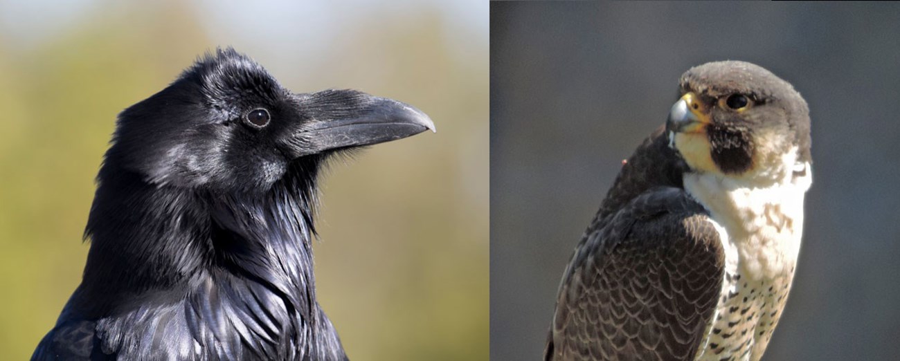 Raven by Neal Herbert / NPS; Peregrine falcon by Dale Cordner / NPS