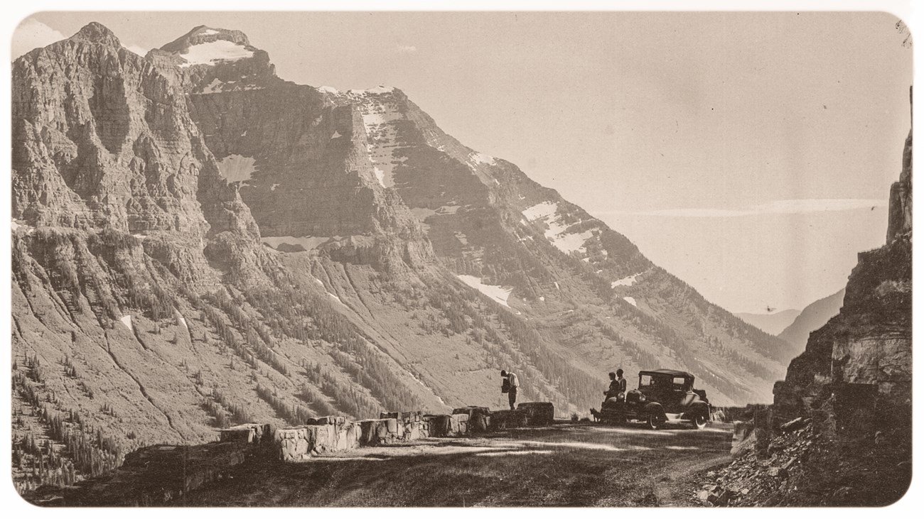 This image was taken by George Grant in 1932 just before Going-to-the-Sun Road was completed. The Ford Model-A parked along the road probably had a fuel efficiency between 10 and 20 miles per gallon.