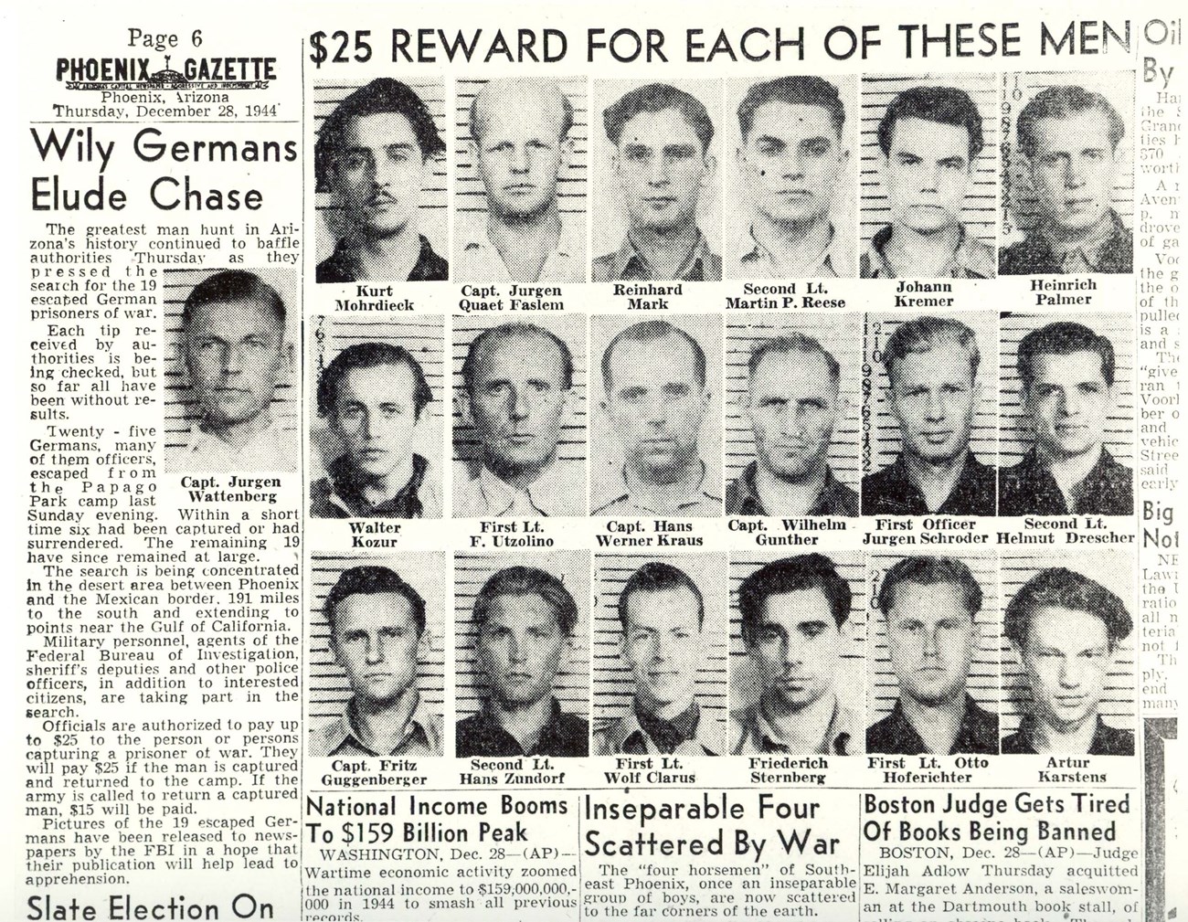 Since it was assumed the escapees would head for the border, 200 miles away, the FBI tipped off the Papago chiefs that if they located a missing Nazi, they could collect $15 from the U.S. Army; if they captured one, it was worth $25.