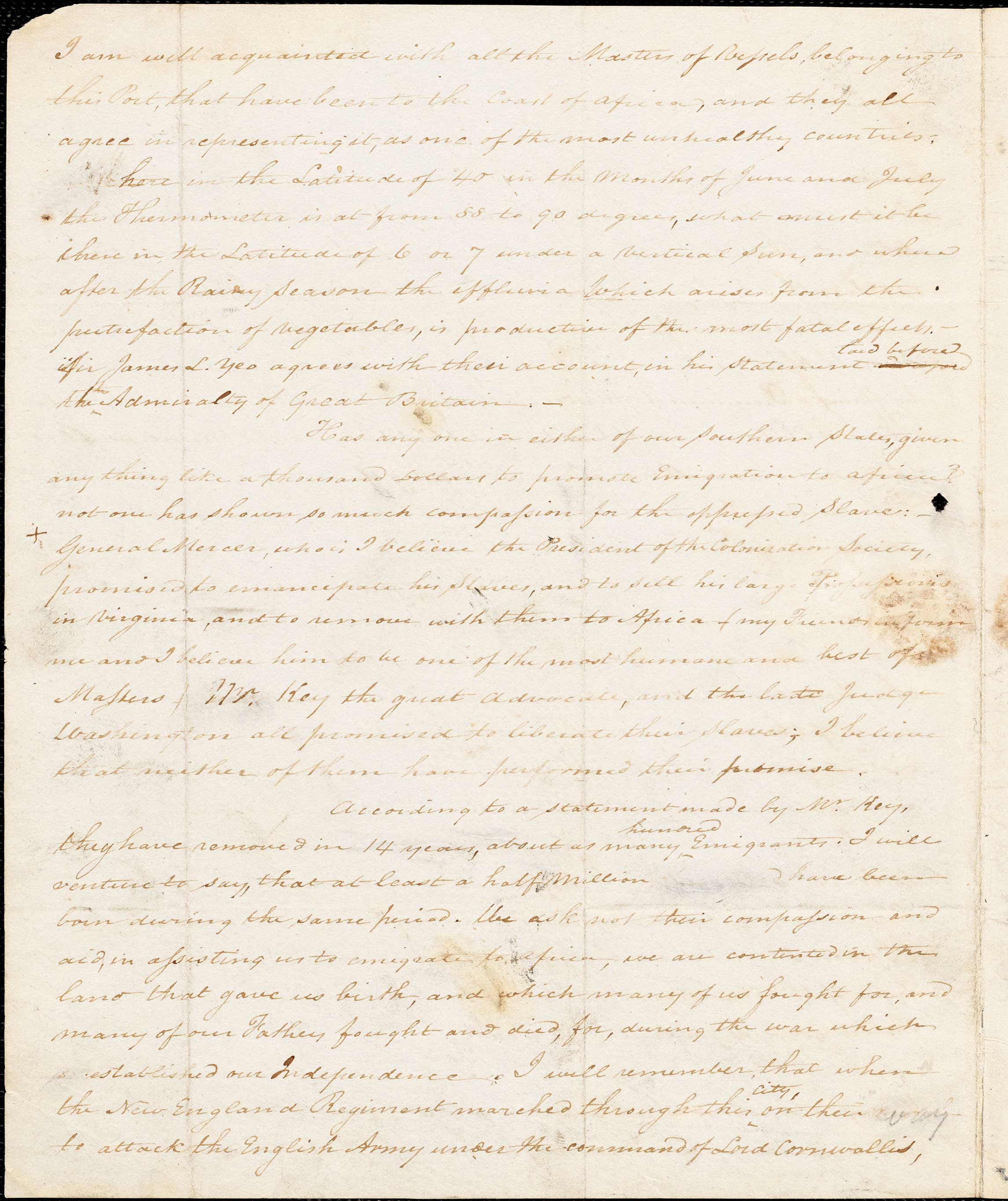 According to a statement made by Mr Key, they e have removed in 14 years about as many hundred emigrants. I will venture to say, that at least a half million have been born during the same period. We ask not their compassion and aid, in assisting us to emigrate to Africa: we are contented in the land that gave us birth, and for which many of us fought, and many of our Fathers fought and died, during the war which established our Independence. I well remember, that when the New England regiment marched through this city on their way to attack the English army under the command of Lord Cornwallis,