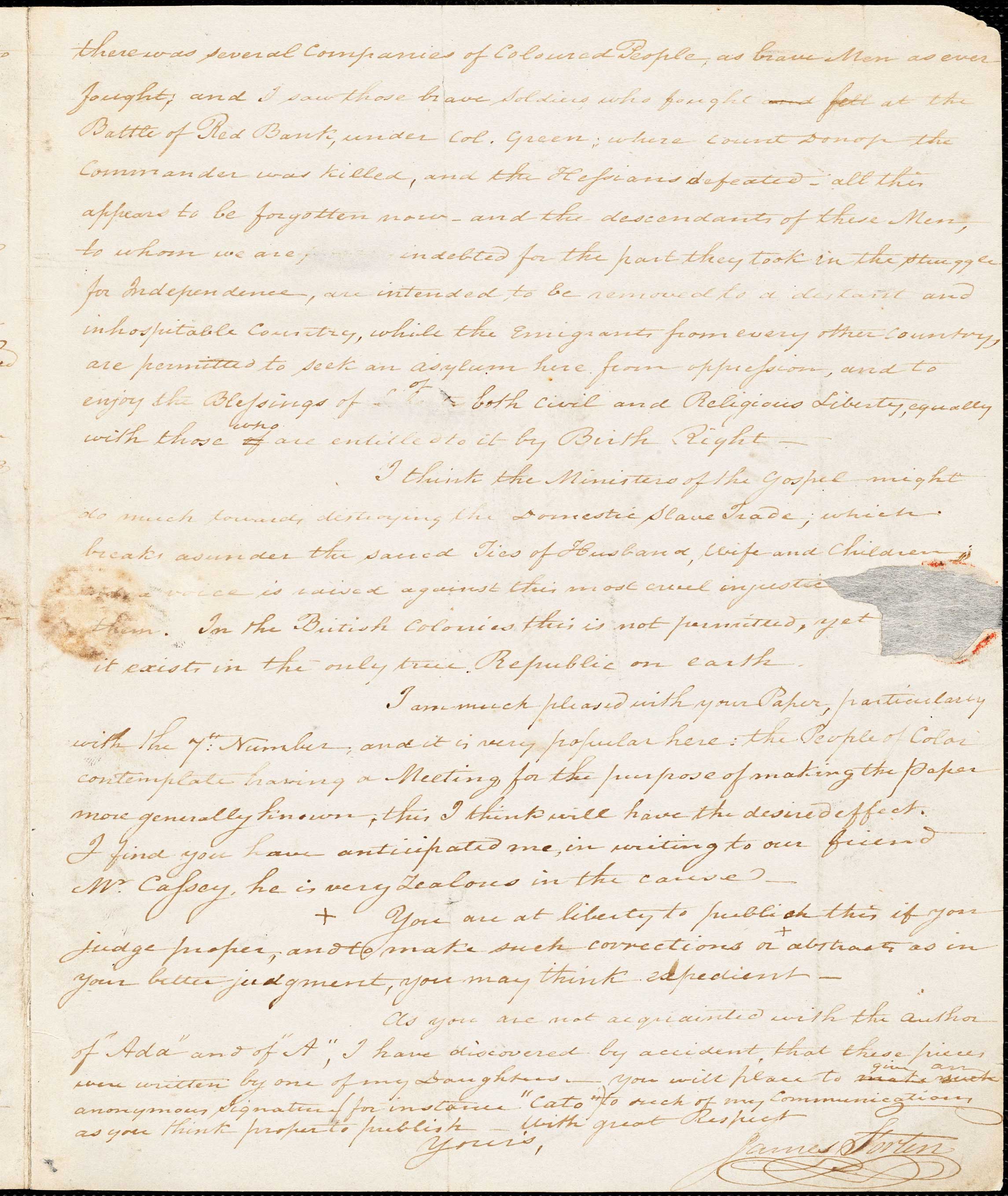 there were several companies of Colored People, as brave Men as ever fought; and I saw those brave soldiers who fought at the Battle of Red Bank, under Col. Green, where Count Donop the Commander was killed, and the Hessians defeated. All this appears to be forgotten now; and the descendants of these men, to whom we are indebted for the part they took in the struggle for Independence, are intended to be removed to a distant and inhospitable country, while the Emigrants from every other country are permitted to seek an asylum here from oppression, and to enjoy the Blessings of both civil and Religious liberty, equally with those who are entitled to it by Birth Right.