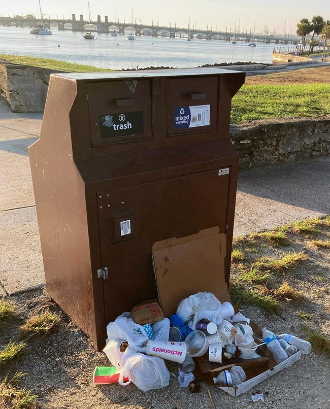 "Take only memories and pictures, leave only footprints." While trash and recycle bins are located on the park grounds, consider taking everything you brought into the park with you when you leave. After the fort's interior closes at 5:15 PM and staff goes home, sometimes visitors exploring the exterior of the fort leave their overflow trash outside the trash bins. Animals and the wind can scatter this garbage around the park, and sometimes it even ends up in the water.