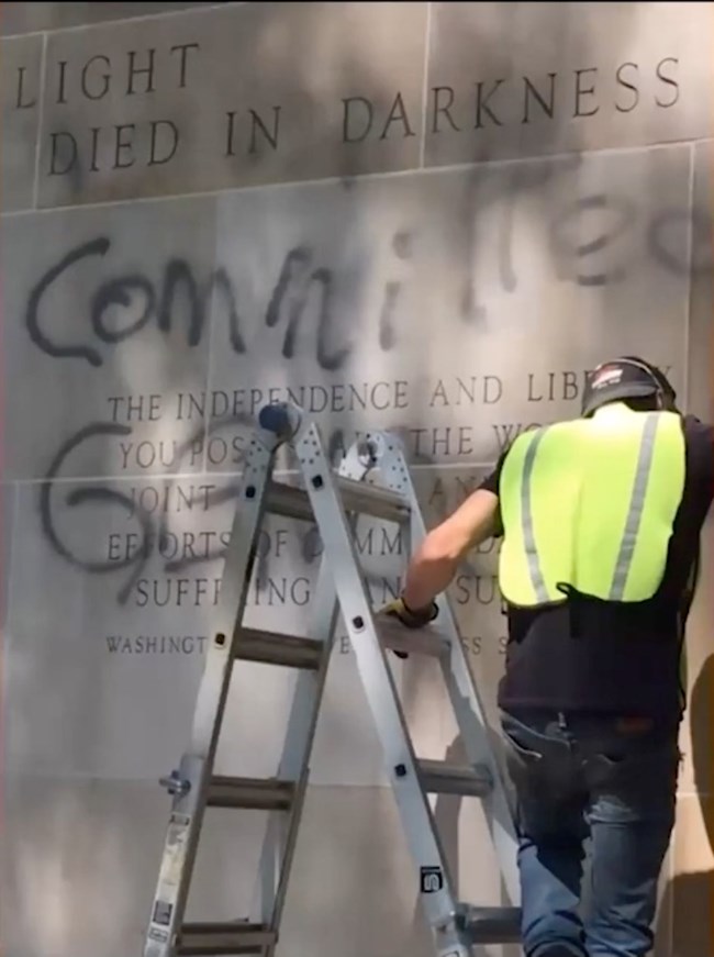 But as the graffiti suggests, not all agree that these freedoms in the United States are shared. Not everyone shares in the celebratory telling of this nation's founding. But we do not know exactly to whom the vandal is referring when they spray-painted "committed genocide," we can assume that it was directed at George Washington and not the Unknown Soldier.
