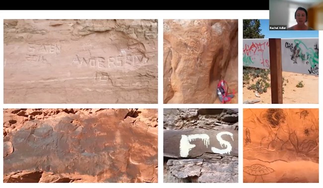 These are all examples of graffiti using various materials on different materials, different types of stone, and on different resources. So we have graffiti on natural resources on cultural resources, and on facilities on bathrooms and on the signs that you see when you go to National Parks. So these are all issues that are dealt with by national park staff, different divisions depending on what the graffiti effects. But it's a pervasive issue that's faced by that's faced across the country.