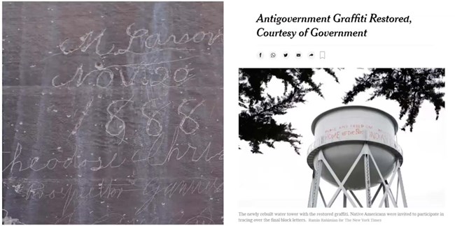 On the right is an article from 2012 in the New York Times which talks about National Park Service led restoration of graffiti at Alcatraz that's associated with the Native American occupation of the island from 1969 to 1971.