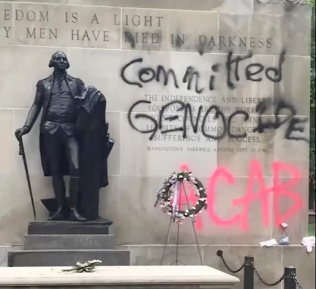 But we do not know exactly to whom the vandal is referring when they spray-painted "committed genocide," we can assume that it was directed at George Washington and not the Unknown Soldier.