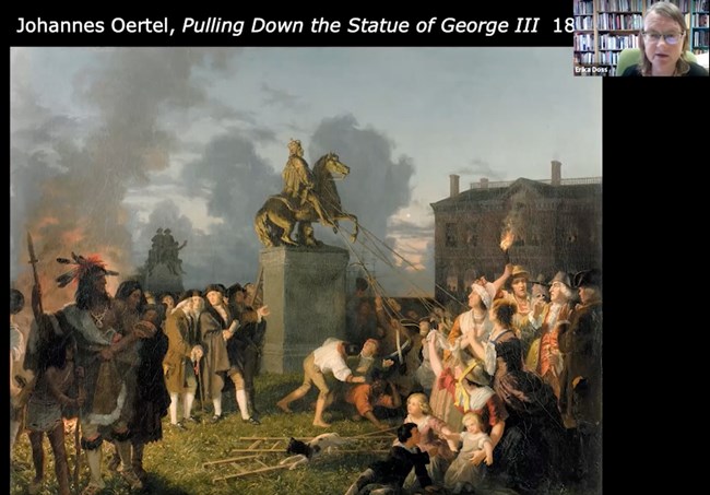 A few years later, William Walcutt also depicted the scene of America's transformation from colony to nation. His paintings similarly shows sacred power falling to the people and suggest how public rituals of cultural vandalism, here seen in the form of statue removal, helped legitimate claims to new forms of social and political authority.