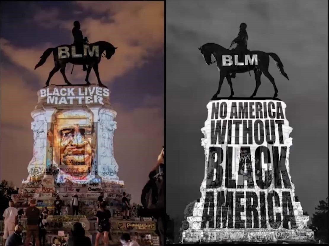 Let me end by showing how those calls for change have been realized, were made manifest in Richmond, Virginia last summer when the images that we see here were projected onto that huge statue of Robert E. Lee, and the entire site became a lively, colorful space of both cultural vandalism and public interaction. Thank you.