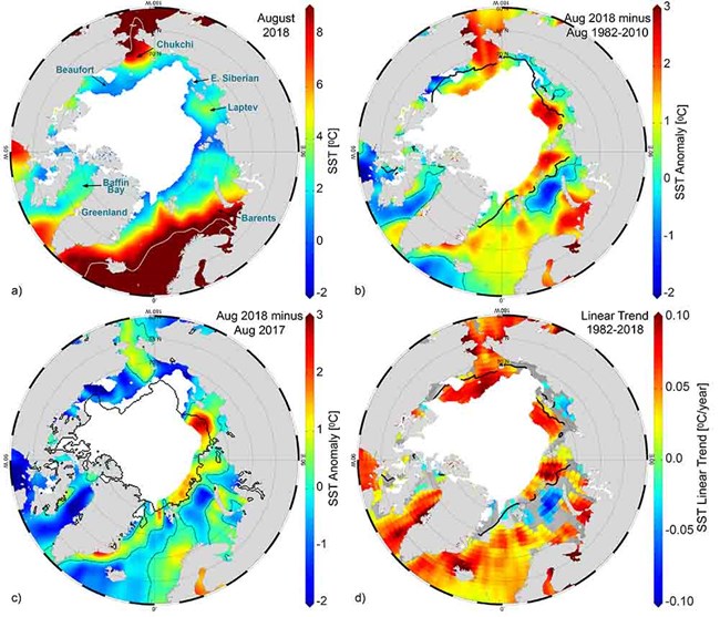 - Spatial patterns of August 2018 SST anomalies relative to the 1982-2010 August mean are linked to regional variability in sea-ice retreat, regional air temperature, and advection of waters from the Pacific and Atlantic oceans.