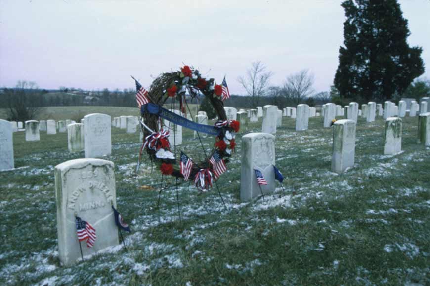 At the end of 1862 Congress established 12 national cemeteries, including one at Mill Springs, for "soldiers who shall die in the service of the country." But the complications of the war meant little happened to fulfill this policy until 1867, when Congress passed comprehensive legislation that led to the development of formal burial sites. That same year William Logan, for whom Logan's Crossroads was named, donated the land for the Mill Springs National Cemetery; its official dedication occurred June 15, 1881. Although only Union soldiers were supposed to be interred there, local residents have said that since men from both sides were buried together just after the battle, some of those moved into the national cemetery were Confederates. Each year on Decoration Day (now known as Memorial Day), flowers were laid by each gravestone as part of ceremonies commemorating the dead.