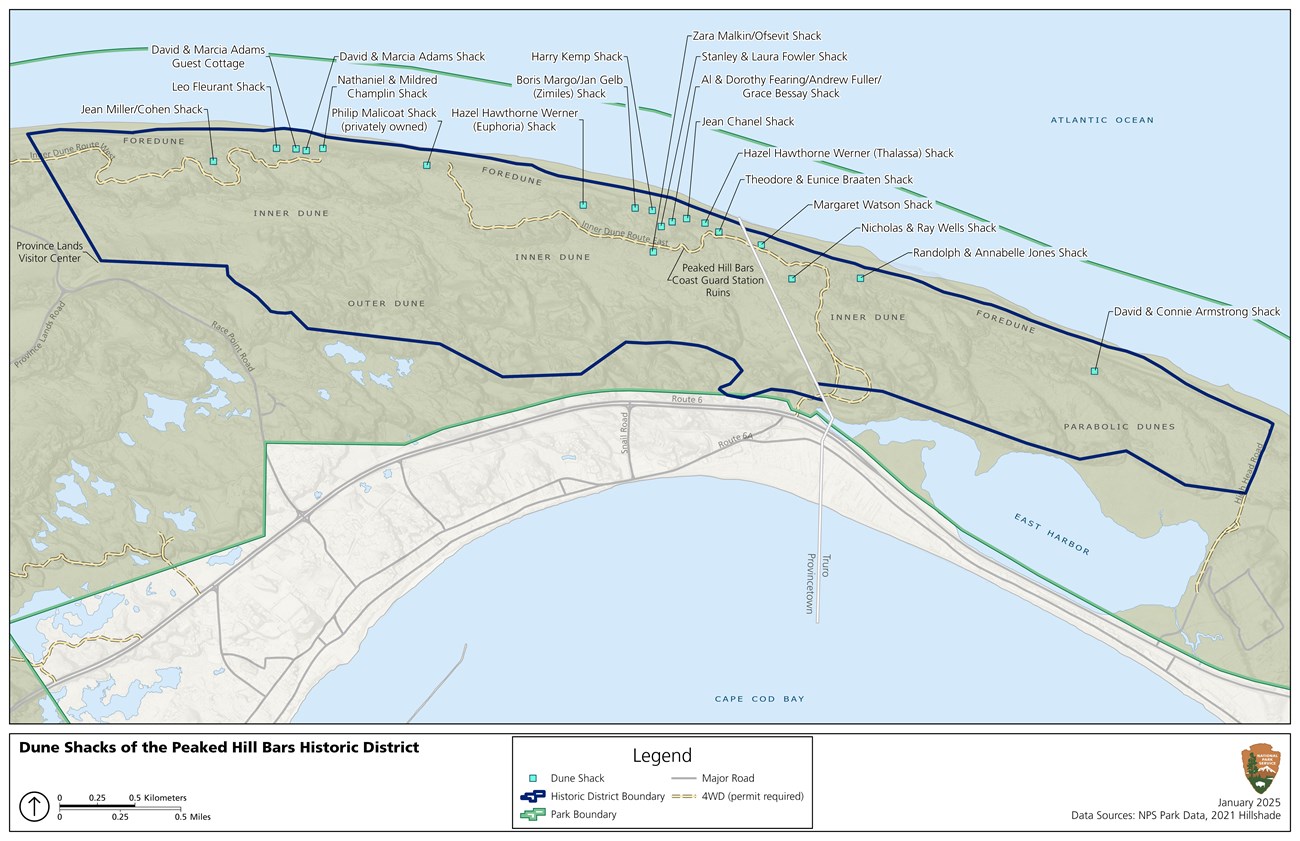 NPS/French The Dune Shacks of Peaked Hill Bars Historic District occupies approximately 1,960 acres within Cape Cod National Seashore at the northern end of the park. The historic district includes both historic buildings, known as dune shacks, and the dune landscape. According to the 2011 National Register of Historic Places documentation, the historic district is significant for its role in the development of American art, literature and recreation; for its association with the life of American poet, Harry Kemp; for its collection of dune shacks which represent a regional waterfront expression of a rare and fragile architectural type of shelters; and for its potential to yield further archeological information about prehistory or history. Eighteen of the 19 dune shacks within the historic district are owned by the National Park Service and are currently occupied by different groups and individuals and used for a variety of purposes. The dune shacks are small, weathered, and often built on pilings to adjust for the ever-moving sand dunes surrounding these properties. The houses are remote, with no paved roads leading to them. Access is required by foot or by 4x4 vehicle along the park’s Oversand corridor. There is limited running water, plumbing, and electrical fixtures in most of the shacks. Most shacks are operated seasonally. The shacks themselves have their roots in the lifesaving huts of the maritime era in the mid-19th century. The first lifesaving station in the area was built in 1872 and was known as the Peaked Hill Bars Lifesaving Station. In 1914, the first recorded transition from a lifesaving structure to a private residence took place. The 1920s through the 1950s saw the construction of the shacks that exist today, and of several that no longer exist. In 1961, when Cape Cod National Seashore was created, dune dwellers continued to live in the shacks. In 1989, the district was found eligible for the National Register of Historic Places because of efforts by long-term dune dwellers, long-term dune shack users, and other advocates, some of whom formed non-profit groups to support dune shack use, as well as the Town of Provincetown and the Massachusetts Historical Commission. In the 1990s, a few locally based non-profit organizations began to offer programs and maintain some shacks in the district. In 2009, the National Park Service obtained funds to initiate an Environmental Assessment (EA) for developing a long-term management plan for the district, to conduct several studies, and to reestablish a Dune Shack Subcommittee of the Advisory Commission, which convened in November 2009. Following several years of significant input from all stakeholders and guided by the findings of the Dune Shack Subcommittee, the park completed the Dune Shack Preservation and Use Plan in 2012. The plan established the roadmap for how the buildings and the adjacent landscape would be protected and interpreted and how residents and visitors would use the district in the future, consistent with the qualities for which the district was determined eligible for the National Register of Historic Places. Emphasis was placed on preserving the contemplative solitude of the district, supporting the long-term relationships in the district, minimizing interference with natural dune processes, providing educational opportunities for the public and partners and establishing preservation maintenance processes. In May 2023, the park announced the Request for Proposals for leasing of eight dune shacks, including the Jones Shack, the Kemp Shack, the Fleurant Shack, the Adams Shack and Guest Shack, the Fearing-Bessay Shack, the Braaten Shack and the Watson Shack. The Request for Proposal period ended July 1, 2023.