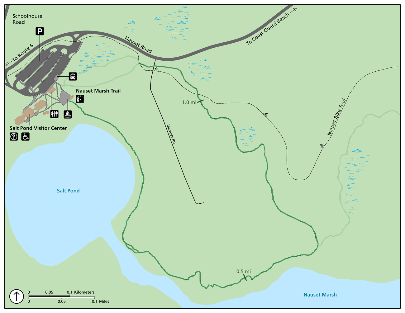 Length: 1.3 mile loop, plus 1.5 mile spur to Coast Guard Beach, one hour. Location: Adjacent to the Salt Pond Visitor Center amphitheater, 50 Nauset Road, off Route 6. Features: This trail winds along the edge of Salt Pond and Nauset Marsh, crosses fields, and returns to the Salt Pond Visitor Center through a recovering forest. There are several spectacular vistas along the way. A minimally-maintained trail extension leads to Doane Picnic Area and Coast Guard Beach. Extension is one mile each way. Conditions: Easy; some log steps; moderate grade; use caution when crossing the bike trail; restrooms located at the visitor center parking area. Elevation Change: 37 feet