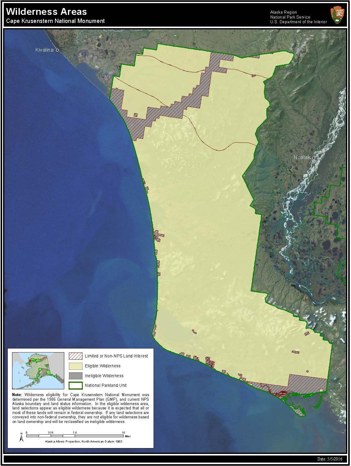 Filming in Wilderness AreasMuch of Cape Krusenstern National Monument is eligible for eligible for wilderness designation in the future (see map). According to National Park Service Wilderness Management Policies, eligible wilderness is managed as designated until it is either officially designated, or removed from consideration, both of which require an Act of Congress. Filming and photography activities must follow all applicable laws and policies to preserve their wilderness character for future generations. Filming activities in wilderness areas must follow all applicable laws and regulations that govern wilderness areas in the park.
