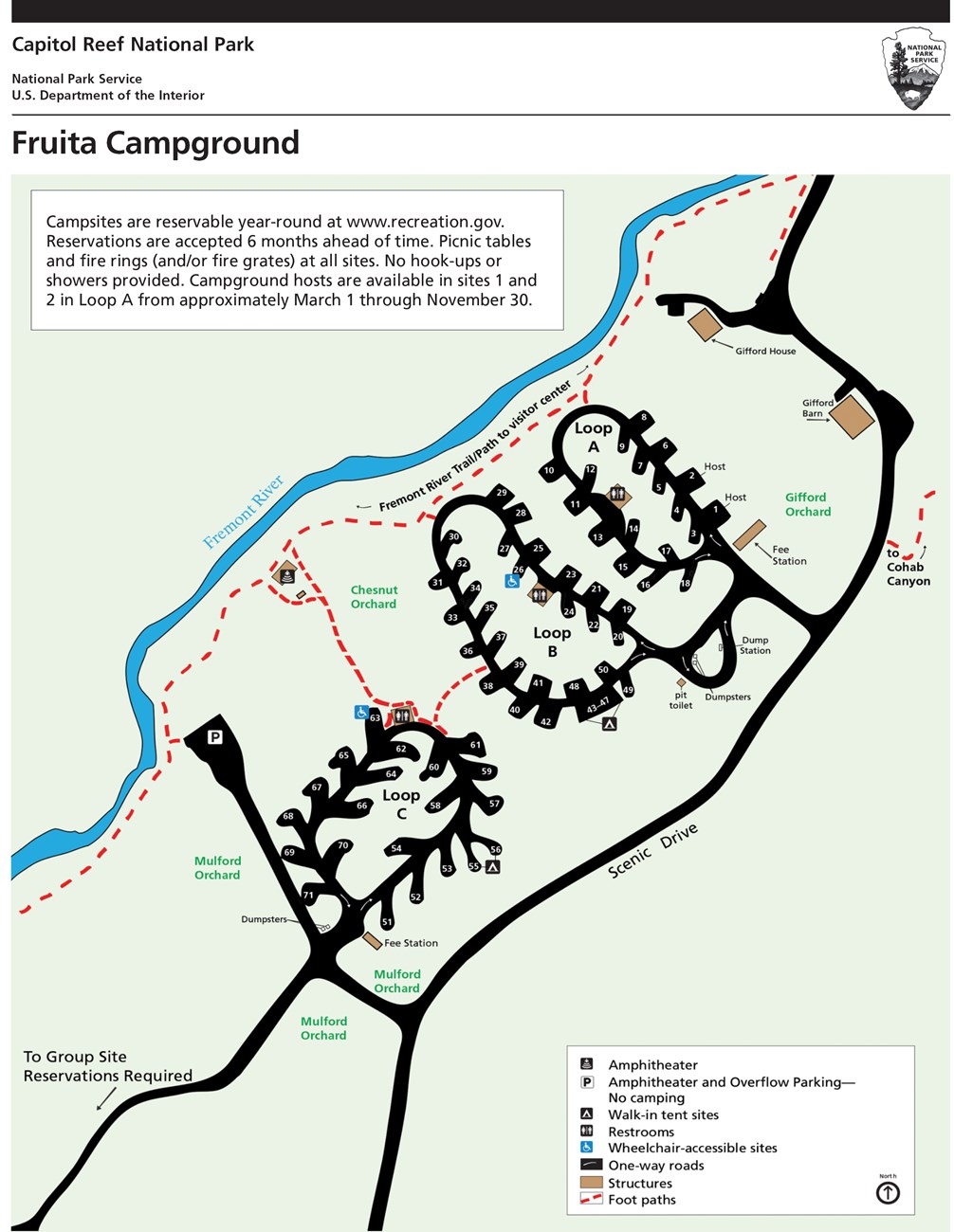 NPS/ Ann Huston Basic InformationThe Fruita Campground is often described as an oasis within the desert. Adjacent to the Fremont River and surrounded by historic orchards, this developed campground has 71 sites. Each site has a picnic table and firepit and/or above ground grill, but no individual water, sewage, or electrical hookups. There is a RV dump and potable water fill station near the entrance to Loops A and B. Restrooms feature running water and flush toilets, but no showers. Accessible sites are located adjacent to restrooms. Rules and RegulationsGenerator use is limited to certain loops and posted generator hours--see the campground regulations page for details. Generators may not be run outside of approved generator hours to power medical devices of other equipment. Campground Hosts are available in sites A1 and A2 from mid-March through the first week of November. Please help preserve your park and provide for a safe and enjoyable visit by becoming familiar with the campground regulations.