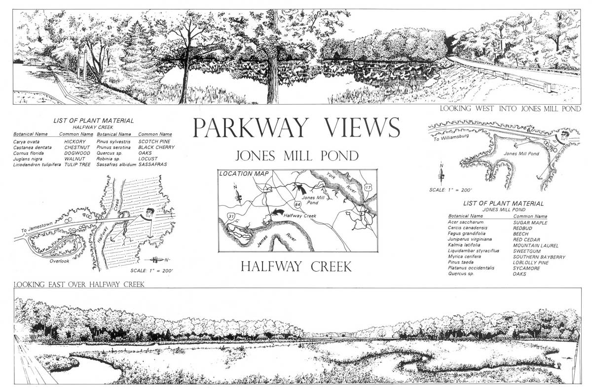 Colonial Parkway was first designed in 1930-31 and developed over a period of thirty years. The historic corridor embodies modern parkway design standards with its curvilinear alignment and scenic intent. The approach used in developing the views was to frame them with native vegetation collected and planted on-site, while also maximizing the visual contact with the York and James rivers. Research and analysis findings have verified the high level of integrity of the overall design, without any significant changes to the parkway’s engineering. (HABS)