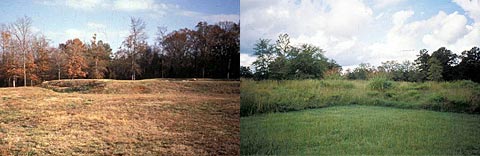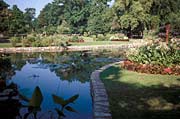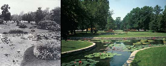 Tower Grove Park in St. Louis, Missouri, is a National Historic Landmark. The Victorian park, famous for its ornamental herbaceous beds, or “bedding-out,” [top,left] had all but lost most of these areas of seasonal plant display to mown lawn for ease of maintenance. [top, right] More recently, these beds have been reinstated using historic photographic documentation and written accounts. The results are herbaceous beds that are of a new design that is compatible with the habit, form, color, texture, scale, massing and context of the historic vegetation. [below] (Tower Grove Park)