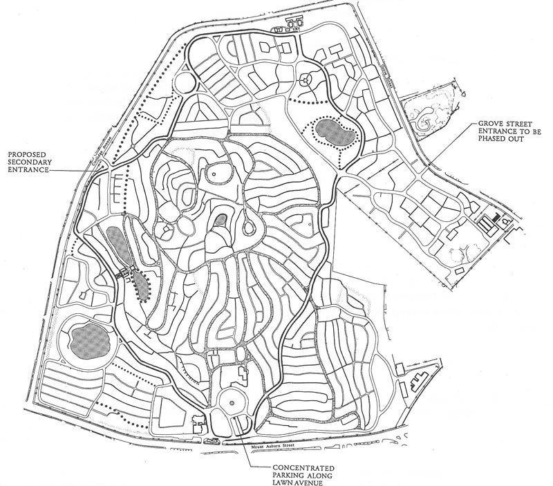 The layout of the circulation system is the centerpiece of Mount Auburn’s landscape design, and the least changed aspect of it. Today there are about 70 miles of paths and 12 miles of roads. The chronological development of the cemetery’s access, circulation and parking has resulted in the proposal for protecting and retaining , and in places, restoring the historic circulation design. (The Halvorson Company)
