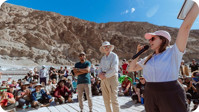 Dr. Caitlin Crawford (NASA - Jet Propulsion Laboratory) gives an enthusiastic talk at Badwater Basin.