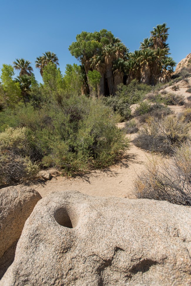 NPS / Brad Sutton ¿Una tierra de abundancia?“¡Oooohhh! ¡Mira toda esta comida!” Katherine Saubel es una nativa de la tribu Cahuilla y describe como se sintió la primera vez que voló el desierto como invitada de la Oficina de Administración de Tierras (BLM en inglés). La Sra. Saubel reconoce las diferencias entre un punto de vista nativo y la forma en que la mayoría de nosotros valoramos el desierto aquí en el Parque Nacional de Joshua Tree. Nuestros visitantes encontraran difícil imaginarse el desierto como una tierra de abundancia de la forma que lo hicieron los primeros agrimensores del área. En 1853, un explorador del U.S. Railroad Survey, reportó: “una cordillera se extiende desde la Montaña San Bernardino en dirección Sureste casi hasta el Colorado. Entre estas montañas y las montañas del Mohave no se sabe nada del país. Nunca he oído hablar de un hombre blanco que lo haya explorado. Me inclino a creer que es un desierto árido y montañoso compuesto por un sistema de cuencas y cordilleras. Sería un lugar extremadamente difícil de explorar debido a la ausencia de agua y no hay temporada de lluvias de ninguna consecuencia.” Primeras pistasEsta escalofriante descripción retrasó el “progreso” por unos años. En 1855, el coronel Henry Washington hizo la primera inspección de la zona, cambio el nombre Nativo del Oasis Mara por “Twentynine Palms.” El siguiente año, un inspector informó: “cerca de los manantiales, la tierra parece haber sido cultivada por los indios. Hay chozas indias en la Sección Treinta y tres. Los indios usan la hoja de la palmera para hacer cestas, sombreros, etc. Alrededor de los manantiales hay un cultivo de caña del cual los indios hacen flechas para sus arcos.” Hacía el 1913, todos los nativos habían abandonado el Oasis Mara. El Instituto de Smithsonian reportó en 1925 que el Oasis Mara pertenecía originalmente al pueblo Serrano. El autor del artículo consideró en su argumento la probabilidad de que el área fuese territorio de Los Chemehuevi, y concluyó: “Realmente, es de poca importancia quienes fueron los soberanos de esta tierra: para todos los efectos estaba vacía.” Los pobladores que abandonaron el Oasis Mara y sus alrededores fueron los Serrano, los Chemehuevi (a veces llamados los Paiutes del Sur) y los Cahuilla. Como vivíanLos Chemehuevi emigraron al sur de California hace aproximadamente 400 años, sus territorios incluyeron La Cuenca Pinto y las Montañas Coxcomb en la parte Oriental del Parque Nacional de Joshua Tree. A finales del siglo 18 se mudaron al Río Colorado. En 1867, la confrontación con la tribu Mojave obligó a los Chemehuevi abandonar el rio, regresando al Oasis Mara que había sido abandonado por los Serrano sobrevivientes de una epidemia de viruela. Las relaciones mejoraron y los Chemehuevi regresaron poco a poco al rio Colorado, ocupando su antiguo territorio, pero un pequeño grupo de ellos permaneció en Twentynine Palms. El territorio de Cahuilla se extendía desde el rio Colorado hasta la llanura de San Jacinto, a las afueras de Riverside. Los Cahuilla, como los Serrano, vivían en pequeñas aldeas cerca de fuentes de agua y explotaban los recursos de su territorio, que se cree incluía las partes Oeste y Sur del Parque Nacional de Joshua Tree. Los Chemehuevi, durante la primavera y el verano, realizaban incursiones de caza y recolección estableciéndose en campamentos temporales. Durante el invierno, los Chemehuevi se agrupaban en aldeas más grandes, se quedaban por periodos más prolongados en estructuras mejor adaptadas donde los pisos eran pequeñas excavaciones en el terreno. Un supermercado auténticoLos territorios dentro y fuera del parque estaban vagamente definidos. A pesar de que los límites territoriales no eran de gran importancia para los pobladores (ninguno parecía estar marcado), sus recursos si lo eran. Los nativos que vivían cerca de lo que es hoy el Parque Nacional de Joshua Tree tenían un gran secreto: era un “supermercado” muy grande. Tenían a su disposición los productos de las plantas como bellotas, vainas de mezquite, piñones, semillas, bayas y frutas de cactus. Los nativos usaban las plantas para hacer arcos y flechas, cordeles, cestas, esteras, recolectores de semillas, y otros artículos, como medicinas. Cazaban borrego cimarrón, ciervos, conejos, pájaros, anfibios y reptiles. |