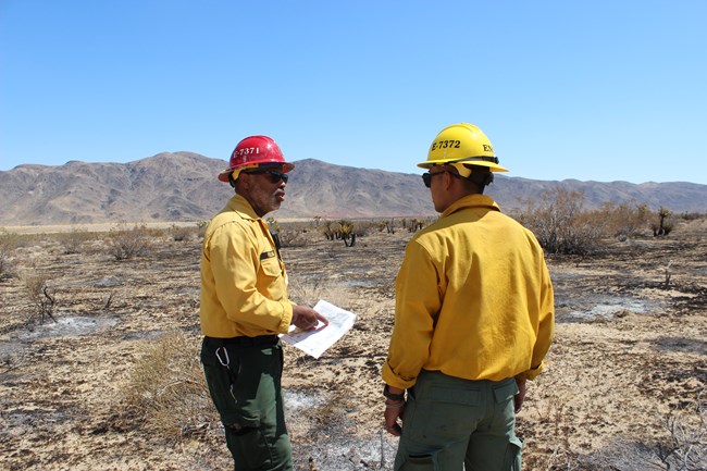 NPS/ Sasha Travaglio Historia y Régimen de IncendiosAunque puede parecer devastador, el fuego es un proceso natural, y el Parque Nacional Joshua Tree ha visto siglos de incendios causados por rayos. Históricamente, los incendios en esta área del Desierto de Mojave eran limitados en extensión porque los arbustos y árboles están muy espaciados en los desiertos y los pastos no son abundantes. Sin embargo, las actividades humanas pueden estar contribuyendo al aumento de la frecuencia y la severidad de los incendios. El parque mantiene registros de incendios desde 1945. La mayoría de estos incendios ocurrieron entre el 18 de mayo y el 20 de septiembre cuando la vegetación del desierto estaba muy seca. El setenta y cuatro por ciento de los incendios fueron provocados por rayos. El veintiséis por ciento restante fueron causados por humanos. El número y la intensidad de los incendios provocados por rayos ha aumentado en los últimos 50 años. Antes de 1965, la mayoría de los incendios por rayos quemaban menos de 0,25 acres. Después de 1965, se han registrado más incendios grandes y más frecuentes. En 1979, el incendio de Quail Mountain quemó 6,000 acres; en 1995, el incendio de Covington quemó 5,158 acres; y en 1999, el incendio Juniper Complex, el mayor incendio en la historia de Joshua Tree, quemó 13,894 acres de enebros de California de lento crecimiento, pinos piñoneros y árboles de Joshua. Recientemente, en 2022, el incendio de Elk quemó unos pocos cientos de acres en el parque y en 2023, el incendio de Geology quemó 1,033 acres. Aunque la mayoría de los incendios en el parque son provocados por causas naturales, los incendios ahora se propagan más rápido y arden con más intensidad debido a la introducción de especies de plantas no nativas. Muchas de estas plantas invasoras son anuales de rápido crecimiento que llenan los espacios entre los arbustos. Cuando se secan con el calor del verano, estas plantas no nativas sirven como fuente de combustible que permite la propagación de los incendios. Las plantas del desierto no necesitan fuego para reproducirse y muchas son muy susceptibles al fuego. Estas plantas vuelven a crecer, pero la recuperación después de un incendio es lenta. Los árboles de Joshua a menudo rebrotan después de un incendio, pero debido a que son muy susceptibles a la sequía y a los roedores que comen su corteza, los árboles jóvenes a menudo mueren. Incluso los arbustos pequeños como el blackbrush pueden requerir cincuenta años para volver a las densidades anteriores al incendio. Además, los pastos no nativos invaden rápidamente las áreas quemadas, desplazando a la vegetación nativa. La clave para manejar el fuego en Joshua Tree radica en comprender cómo los incendios afectan la vegetación y la vida silvestre en un entorno desértico. Los biólogos están monitoreando las consecuencias a largo plazo del fuego en los ecosistemas desérticos, así como la efectividad de los tratamientos diseñados para acelerar la recuperación. Para ayudar a preservar y proteger la vida silvestre, el paisaje y los procesos naturales, cada parque desarrolla su propio Plan de Manejo del Fuego. En Joshua Tree, nuestro plan actual prevé la supresión total de todos los incendios, incluidos los causados naturalmente, hasta que tengamos una mejor comprensión del comportamiento del fuego y los efectos del fuego en el parque y en todo el Desierto de Mojave.