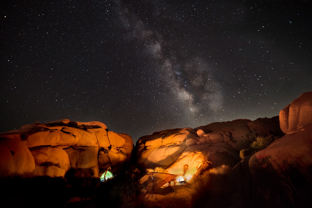 NPS / Hannah Schwalbe Hamacas:Atar líneas, sogas, cuerdas a la vegetación incluyendo los árboles de Joshua y enebros está prohibido. Las hamacas, líneas y otras cuerdas horizontales tienen que ser atadas a rocas y pernos de escaladas y no están permitidas en las áreas de las zonas de acampar.Abierto por la temporada Información básicaHay 124 sitios individuales y para familias en el campamento Jumbo Rocks. Se requiere reservaciones durante la temporada alta, de Octubre a Mayo. El campamento está ubicado en el centro y ofrece excelentes vistas de las formaciones rocosas.