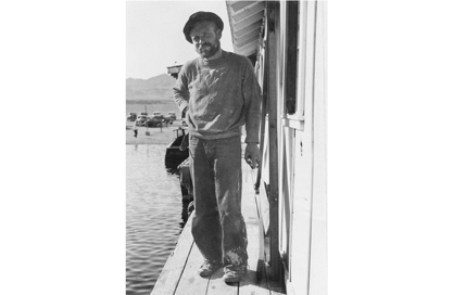 Buzz Holmstrom as he appeared when arrived at the Boulder City boat landing after travelling alone in a rowboat from Green River WY to Lake Mead, November, 1937