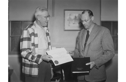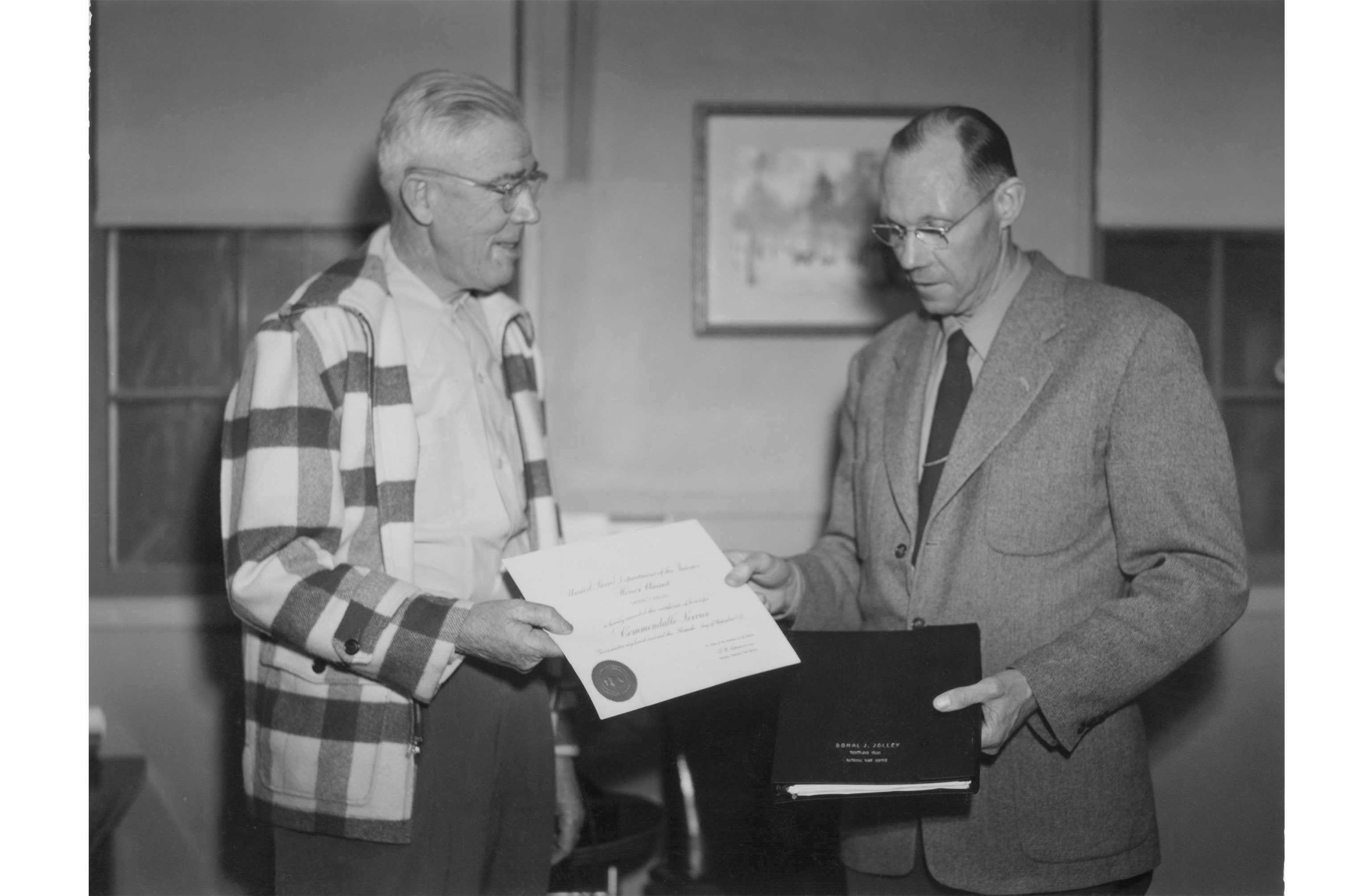 Chief Ranger and Supt. George Baggley presents Donald J. Jolley a lifetime parks pass upon his retirement, January, 1952