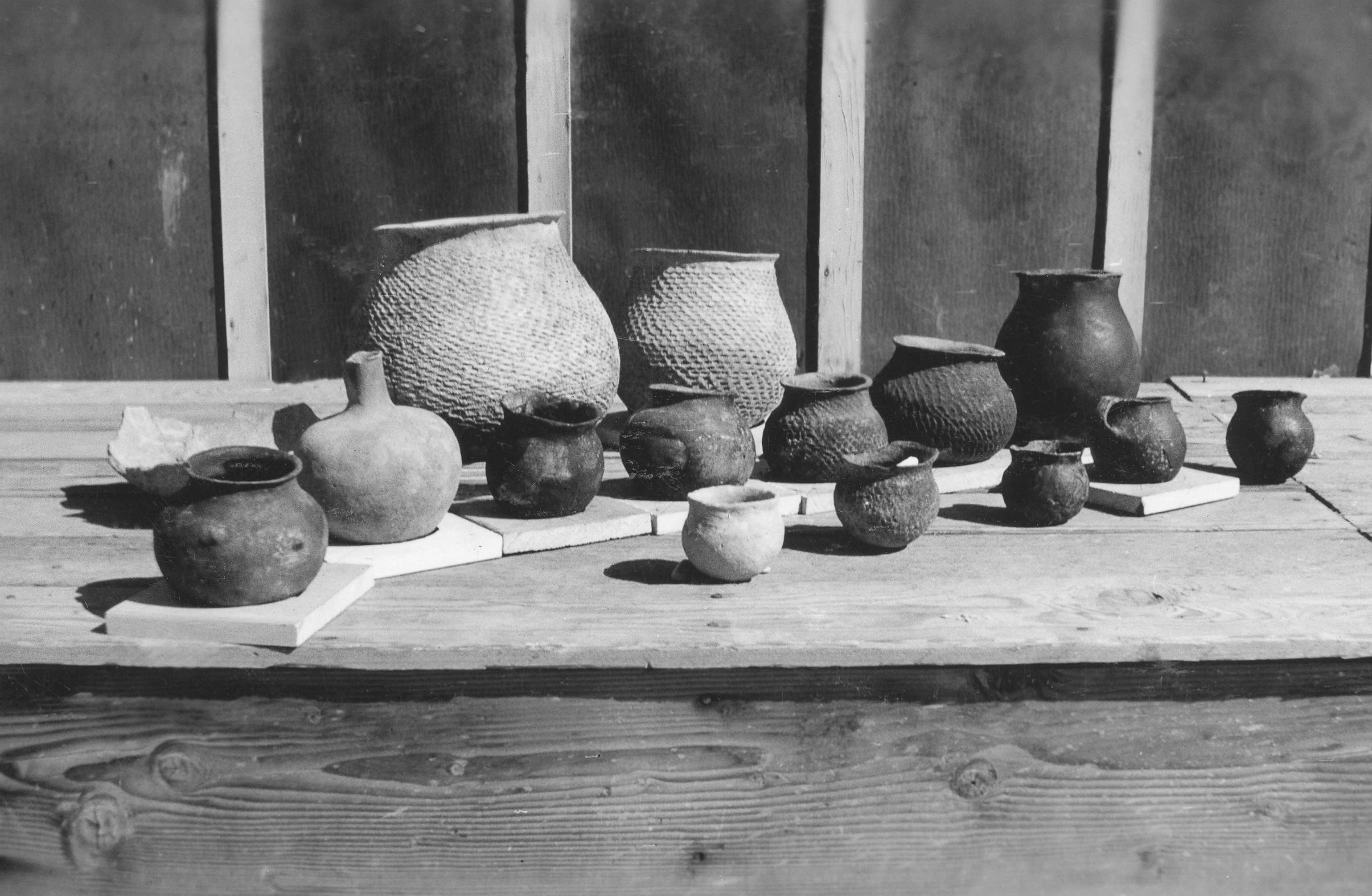Collection of cooking pots and one water olla, Boulder Dam State Park Museum, September 1936