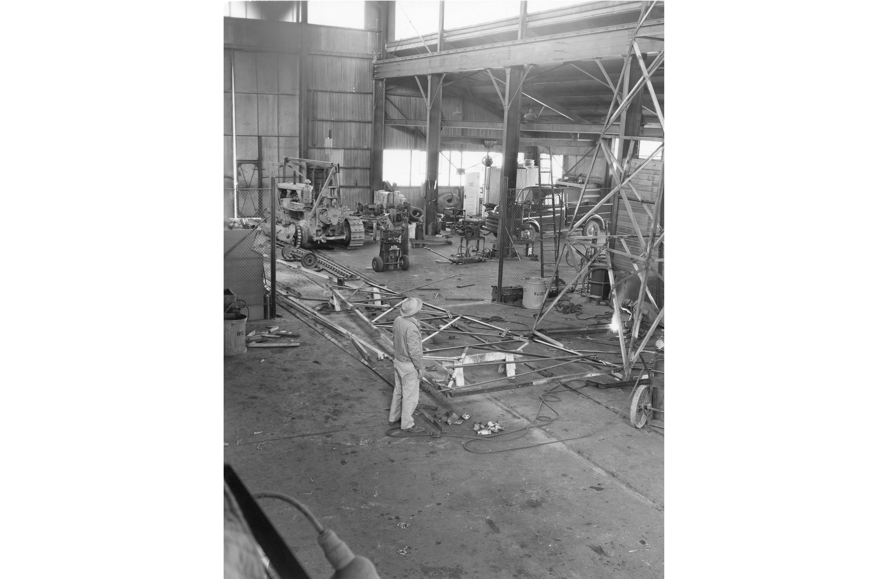 Transmission tower being built for use at Boat Harbor at NPS Warehouse, December 8, 1950, electrician Bob Beard standing