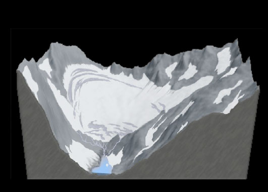 This page was written to familiarize visitors to this site with what glaciers are, how they behave, how they shape landscapes, and how they are impacted by climate change. In addition to the words and images on this page, you can also access a series of interactive animations and graphics that allow you to "see" the processes and structures described below. These information modules are written in Adobe Flash so your web browser will need to be have a plug-in for Flash 7 or higher. Fortunately most computers and web browsers come with this player already installed. If your web browser doesn't read these files you can download a player free of charge at < http://www.adobe.com/products/flashplayer/