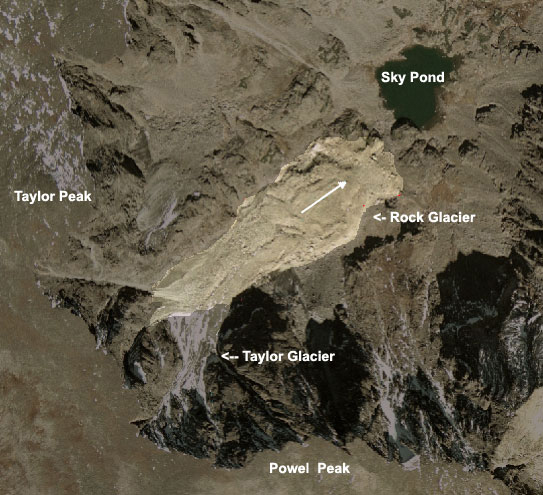 | Figure 4 – A rock glacier located below Taylor and Powell Peak in Central RMNP. The glacier is flowing out from the base of Taylor Glacier toward Sky Pond. |