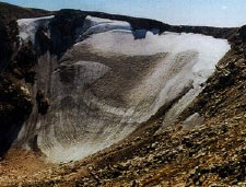 Rock glacier: A large mass of rock that actively flows like a glacier. Boreholes drilled in rock glaciers have revealed primarily a mixture of ice and rock (1). Many scientists consider rock glaciers a form of permafrost, but other researchers believe some rock glaciers may form from small glaciers being covered by rock debris (2). In any case, these complex mixtures of ice and rock flow downhill at speeds up to 1-2 m/year. Rock glaciers in RMNP have been clocked at 13-20 cm/year (3). While rock glaciers have a characteristic glacier-like or lava-like appearance from the air, they can be hard to recognize on the ground, as they look like nothing more than a rock field or talus slope. Rock glaciers exist below Taylor and Tyndall glaciers, as well as in many other locations without glaciers. If you visit them, take care, because the surfaces of rock glaciers are extremely unstable.