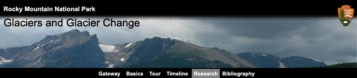 This page summarizes some of the glacier research being done in Rocky Mountain National Park and some of the techniques commonly used to study glaciers. In addition to the words and images on this page, you can also access a series of interactive animations and graphics that allow you to "see" the techniques described below. These information modules are written in Adobe Flash so your web browser will need to have a Flash 7 or higher plug-in installed. Fortunately most computers and web browsers come with this player already installed. If your web browser doesn't read these files you can download a player free of charge at < http://www.adobe.com/products/flashplayer/