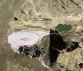| Figure 2 - A 2001 aerial photograph of Andrews Glacier with outlines for 1946 (red), 1962 (yellow), and 1990 (blue). |