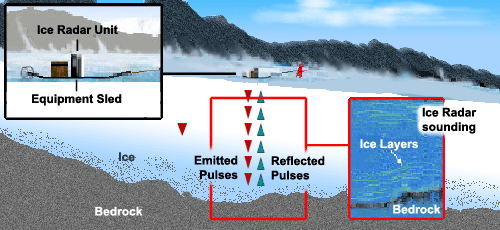 | Figure 3 - Ice penetrating radar used for mapping the glacier bottom and ice thickness. The top inset shows the general structure of the unit, while the middle frame shows how it operates. The inset on the right shows an ice radar sounding, which is a vertical profile of the glacier. |