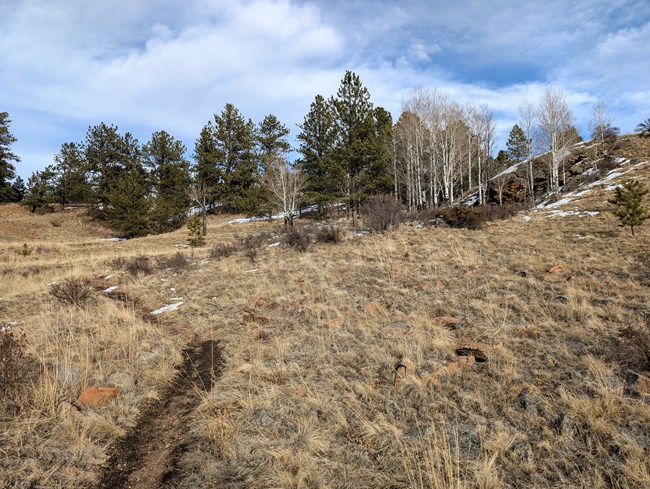 NPS Photo/Peterson Hornbek Trail - 3.9 miles Following meadows, the trail to Hornbek Homestead crosses land once covered by ancient Lake Florissant. The return route overlooks the ancient lake and the mountain ranges beyond. Signs of wildlife are common. MODERATE Elevation change: 322 ft. Trail Profile