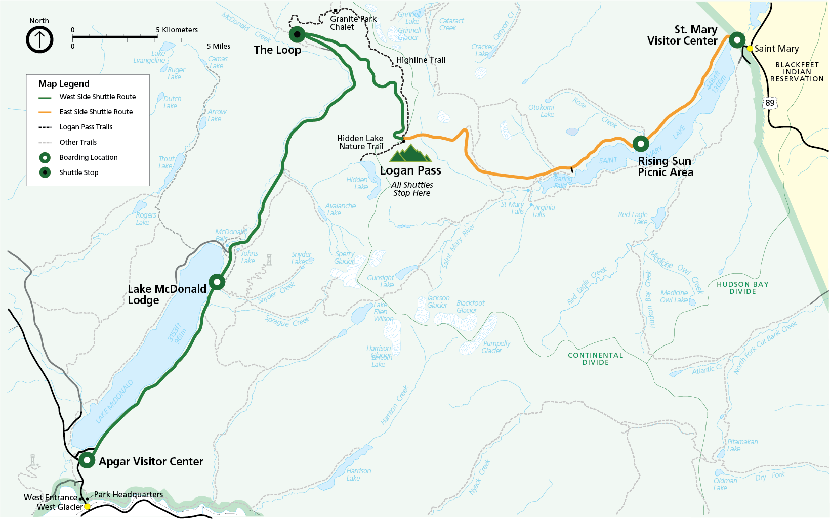 All shuttles drop off at Logan Pass in the morning and return to boarding locations in the afternoon.Boarding Location Departure TimesWest side boarding locations (in green) include Apgar Visitor Center and Lake McDonald Lodge. East side boarding locations (in gold) include St. Mary Visitor Center and Rising Sun Picnic Area.