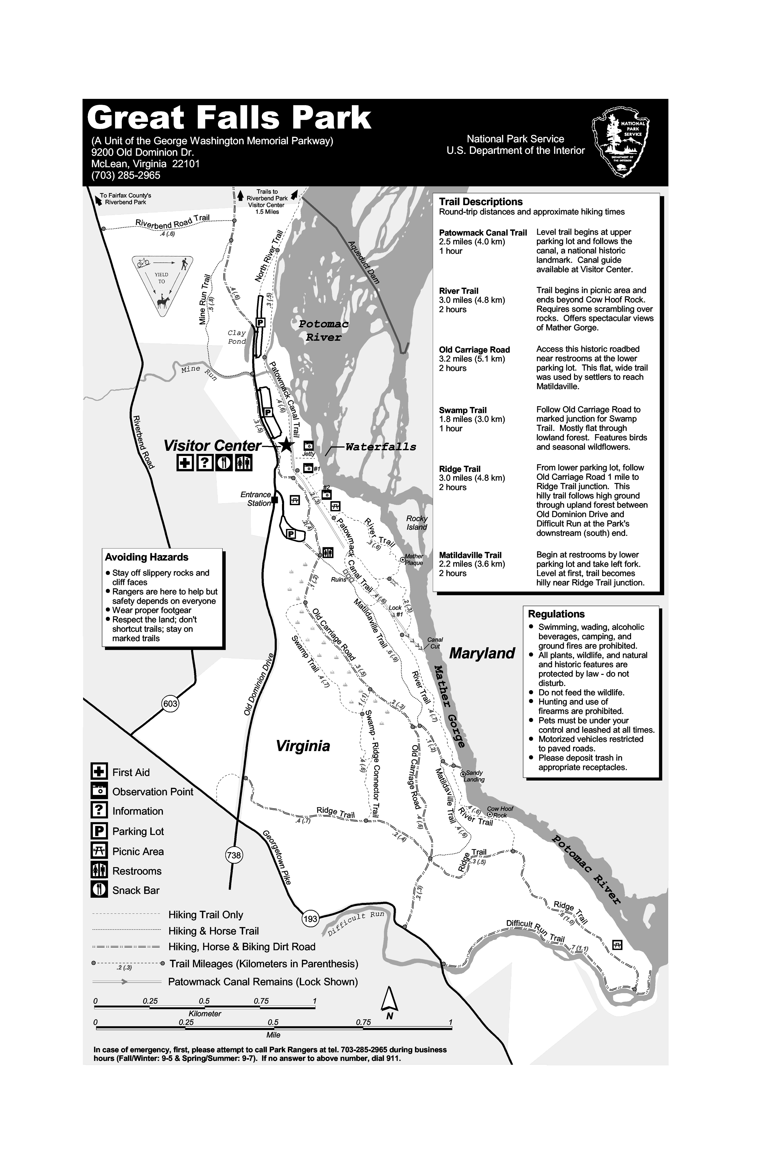The maps and brochures below will open in a new window. Great Falls Park hiking map: letter size- A detailed trail map with trail descriptions and distances in miles and kilometers. This is a .gif image. |