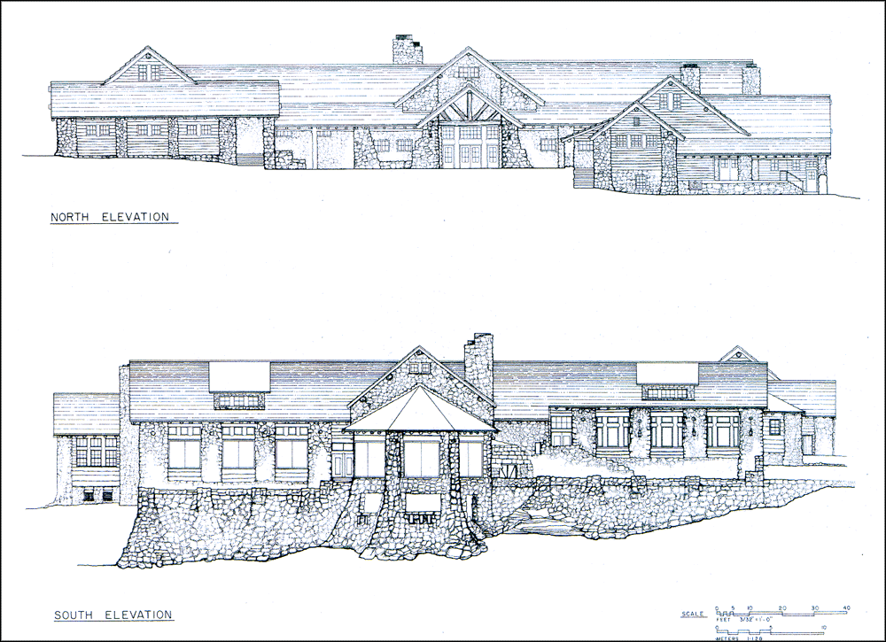 These elevation drawings demonstrate how the Grand Canyon Lodge underscores the horizontal lines of the mesa and layered canyon walls in its materials and proportions.