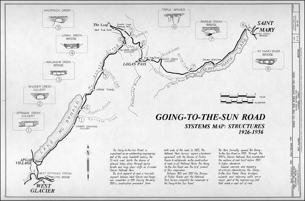 Going-to-the-Sun Road, the first National Park Service transcontinental divide road, had a profound impact on road design policy throughout the National Park system even before it was complete. As the primary circulation route in the park, Going-to-the-Sun Road allows for interpark travel between Yellowstone and the Pacific Northwest, and is an excellent example of a sensitive response to topography and scenic features. The 49-mile road and its associated features are a defined historic district which collectively retain extraordinary integrity and offer nearly the same experience for visitors today as they did during the early years. In 1983 Going-To-The-Sun Road was included in the National Register of Historic Places and in 1985 was made a National Historic Civil Engineering Landmark.7