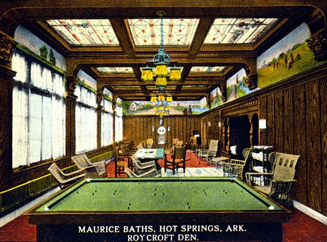 NPS photo TodayThe Maurice Bathhouse is the only unoccupied historic bathhouse remaining on Bathhouse Row and will soon become available for commercial leasing. Bathhouse HistoryThe Maurice Bathhouse first opened on January 1, 1912 to replace an existing Victorian-style building. The previous bathhouse had been known as the Independent before being renamed after previous owner Charles Maurice. With a total floor space of 23,000 square feet, the three-story bathhouse had ample room for a complete range of services and amenities, including a gymnasium, staterooms, a roof garden, and twin elevators. In the 1930s, a therapeutic pool was installed in the basement for the treatment of arthritis and polio. It was the only bathhouse on the Row to have a pool. During its six decades in the operation, over 2.5 million therapeutic baths were provided. The Maurice was the second bathhouse to close on Bathhouse Row, shutting its doors in November 1974. NPS Architecture & DesignDesigned by architect George Gleim, Jr., of New York City, the Maurice Bathhouse was the first bathhouse fully modernized bathhouse in Hot Springs, incorporating the most state of the art heating, plumbing, and ventilation of the day. The building design is an eclectic combination of Italian Renaissance Revival and Mediterranean styles. The interior boasted a lobby lined with gilded oak pilasters and large stained glass skylights throughout the building. The new building boasted a capacity for 650 bathers-a-day.