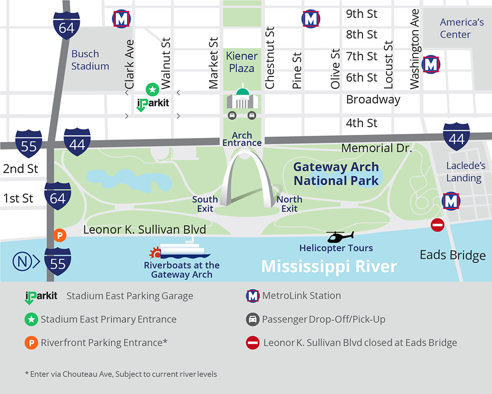 The park is located in downtown St. Louis, Missouri. It is located in the Midwest (managed by Interior Regions 3, 4, and 5).