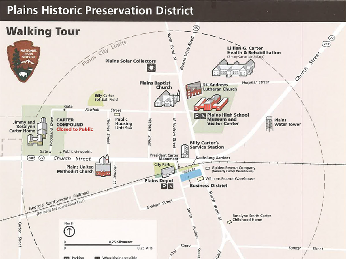 Directions to Jimmy Carter National Historical Park Exploring PlainsOnce you have arrived at Jimmy Carter National Historical Park, there are several areas to visit.*=sites on driving tour Visitor Center300 N Bond St, Plains, GA 31780. Plains High School serves as the park museum and visitor center. Visitors find a restored and furnished classroom, principal's office, and auditorium. Other rooms feature exhibits that explain the Carters' lives in Plains, including political and business careers, education, family, and post-presidency. There is a 25-minute video that focuses on the life and accomplishments of Jimmy Carter told by those who know him best - his friends, neighbors, and family.*Jimmy Carter Boyhood Farm402 Old Plains Hwy, Plains, GA 31780. When the Boyhood Farm became part of the park in 2000, the farm was restored to its appearance before electricity was installed in 1938. As you stroll along the walking path, stop and read the wayside exhibits at various points along the way. Push the buttons on the audio stations to listen to Jimmy Carter share stories about his childhood.Today the farm hosts honeybees, goats, chickens, mules, and farm cats that are active on the Boyhood Farm. Crops are still grown periodically throughout the year which include sugarcane, cotton, corn, tomato, and peanuts. Preservation DistrictThe Jimmy Carter National Historical Park and Preservation District includes more than twenty structures significant to the lives of the 39th president and his wife, Rosalynn, in their hometown of Plains, Georgia. It is where Jimmy Carter went to school, went to church, met and married Rosalynn Smith, and launched his political career.Plains Depot 100 West Main Street. The depot was completed in 1888. The town, then named Plains of Dura, moved a short distance south to take advantage of the new railroad and shortened its name to Plains. In 1919, 66 carloads of hogs and cows were shipped from the depot. In the 1920s, 6,000 to 10,000 bales of cotton were shipped annually from Plains. The building has been restored to its 1976 appearance as Carter’s campaign headquarters. *Lebanon Cemetery Old Plains Highway. Earl and Lillian Carter are buried here, as are Jimmy’s sister Gloria, brother Billy, and other family members. *Rylander House Old Plains Highway. Known locally as the Haunted House, Jimmy and Rosalynn rented this house from 1956 to 1961. Built about 1850, it is one of the country’s oldest houses. Generations of ghost stories have inspired its nickname. Plains United Methodist Church Church and Thomas Streets. In 1945, while on leave from the US Naval Academy, Jimmy Carter went on a date with his sister Ruth’s best friend, Rosalynn Smith. After his graduation, they were married in this church on July 7, 1946. Public Housing Unit 9-A Paschal and Thomas Streets. “Not having any assured income,” wrote Jimmy Carter about their return to PLains in 1953, “we applied for—and were assigned—an apartment in the new housing project in Plains”. The Carters lived in the apartments for a year. The complex still provided public housing. Plains Baptist Church Bond and Paschal Streets. Jimmy Carter was baptized here, and his family attended this church when he was growing up. The Carters attended services here until they left for Washington, DC, in 1977. Billy Carter’s Service Station Church Street. Jimmy Carter’s brother Billy owned and operated this gas station from 1972 to 1981. It was a popular place for visitors and members of the media. Business District Main Street. These brick commercial buildings were built in the 1890s. Downtown Plains remains little changed since Jimmy Carter’s youth. Plain Peanut Main Street and Rosalynn Carter Trail. Formerly the Carter Warehouse complex, this was the site of the family farm supply business as it expanded in the years before Jimmy Carter became president. Lillian Carter Health & Rehabilitation Hospital Street. Lillian Gordy Carter worked as a registered nurse when this was the Wise Sanitarium, one of the first small Georgia hospitals to receive accreditation. Jimmy Carter was born here on October 1, 1924. *Maranatha Baptist Church Buena Vista Road. The church was established when the congregation of the Plains Baptist Church split in the late 1970s. Jimmy and Rosalynn Carter have been members here since 1981. Rosalynn Smith Carter Childhood Home Rosalynn Carter Trail. Home where Rosalynn lived until her marriage to Jimmy Carter. St. Andrews Evangelical Lutheran Church Bond Street. Rosalynn attended as a child with her grandmother, Rose Wise. Plains Solar Collectors Installed on Carter land, the collectors generate about 60% of Plains’ energy demand. *Smiling Peanut Buena Vista Road. From a Carter rally in Indiana, a reminder of the peanut imagery of the campaign. Other Jimmy Carter SitesThe Carter Presidential Center in Atlanta (160 miles) includes The Carter Center and the Carter Library and Museum. |