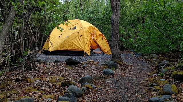 Campers must be in a designated site and are limited to a maximum of two tents and/or eight people per site. You may not sleep in a RV, camper or other vehicle in the campground parking area and overnight parking is not permitted in any other part of the Exit Glacier area. A central food storage, cooking and dining shelter is provided. Cooking and/or storing food in campsites is prohibited. There is a pump for drinking water and pit toilets are available. Pets are not permitted in campsites. Backcountry camping is allowed throughout the park except within 500 feet of a public use cabin or within 1/8 mile of a road or trail at Exit Glacier. Two of the campsites, #1 & #12, are accessible sites. Paths to the two sites, vault toilets, and cooking area are crushed rock or asphalt.