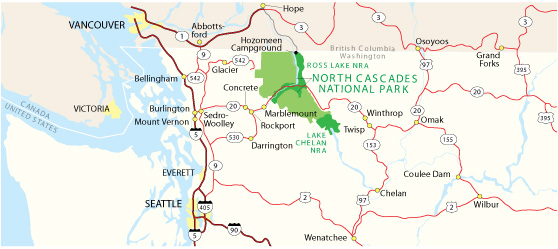 Most visitors arrive at North Cascades National Park by car. Public transportation options to and from the park are extremely limited but bicycling is a popular and green alternative to driving. North Cascades National Park and Ross Lake National Recreation AreaPrimary access to both North Cascades National Park and Ross Lake National Recreation Area is from the State Route 20 (SR 20) corridor. The Silver-Skagit Road and State Route 542 (SR 542) are jumping off points for many northern regions of the park including Hozomeen, Mount Shuksan, and Copper Ridge. North Cascades HighwayFrom the west, SR 20 (North Cascades Highway) connects with Interstate 5 (Exit 230) at Burlington. From the east, the highway intersects with U.S. Route 97 at Okanogan and with State Route 153 at Twisp. Due to avalanche danger, the Washington State Department of Transportation typically closes the roadway between Ross Dam Trailhead and Lone Fir Campground from November to April. HozomeenThe Silver-Skagit Road to Hozomeen provides the only road access to the Ross Lake shoreline. This 37 mile (60 km) gravel road connects with B.C. Highway 1 (Exit 168) near Hope, British Columbia. Water taxi and portage services on Ross Lake are available through Ross Lake Resort. Mount Shuksan, Northern Pickets, and Copper RidgeHiker and climber access to Copper Ridge, the northern Picket Range and Mount Shuksan is available from State Route 542 (SR 542) east of Bellingham. The Sulphide Glacier route on Mount Shuksan is reached from the Baker Lake Road at milepost 82 on the North Cascades Highway. Lake Chelan National Recreation AreaThere is no car access to Stehekin and Lake Chelan National Recreation Area. Passenger shuttle service is provided in the Stehekin Valley. By BoatPassenger ferry service is available from Chelan on U.S. Route 97. Additional information on float plane and private boat access is available at the Getting to Stehekin page. On FootHiker access to Stehekin begins at the Cascade Pass trailhead on the gravel Cascade River Road, the southbound Pacific Crest Trail from State Route 20 near the Rainy Pass picnic area, and from Eagle Creek, War Creek, South Creek and Gilbert trailheads on the Twisp River Road. Some of these trails are suitable for stock. For more information, please refer to our Trail Guide. Air Service to Stehekin |