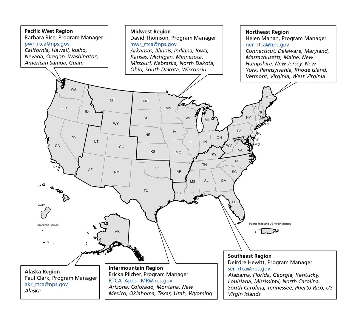 NPS-RTCA staff support communities and public land managers in all 50 states and the territories of American Samoa, Guam, Puerto Rico, the Northern Mariana Islands and the U.S. Virgin Islands. For any local or regional project questions or comments, we encourage you to reach out to the program manager representing your state.